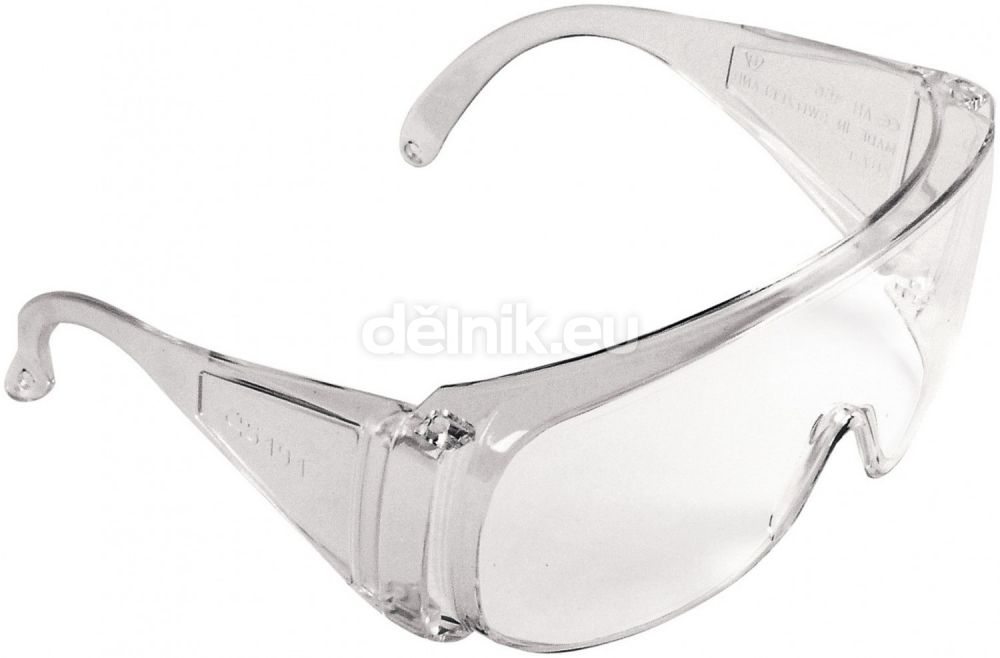 Ochranné brýle s čirým polykarbonátovým zorníkem tř. 1F, panoramatického tvaru a možností nasazení na dioptrické brýle.