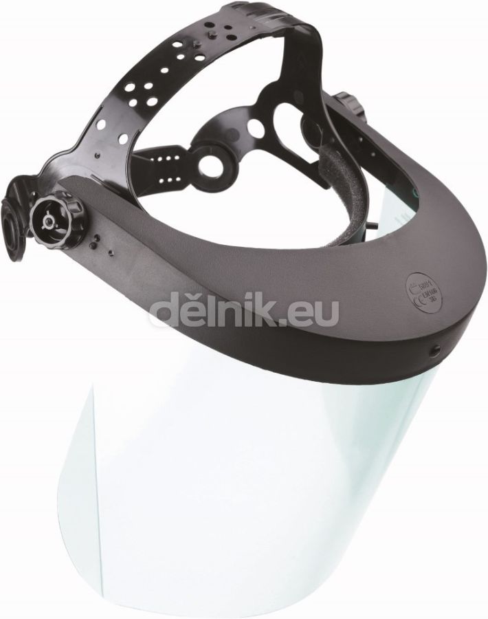 Čirý PC celoobličejový štít s náhlavním držákem a zorníkem třídy F. Vyhovuje normě EN 166.