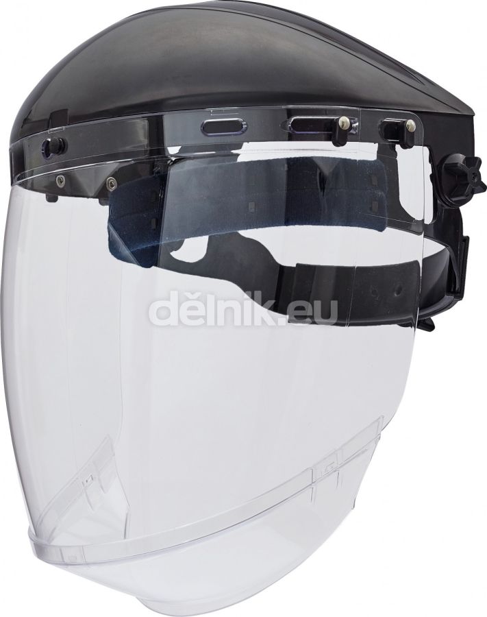 čirý PC celoobličejový štít s náhlavním držákem z ABS; zvýšená ochrana v oblasti brady; zorník třídy 1AT