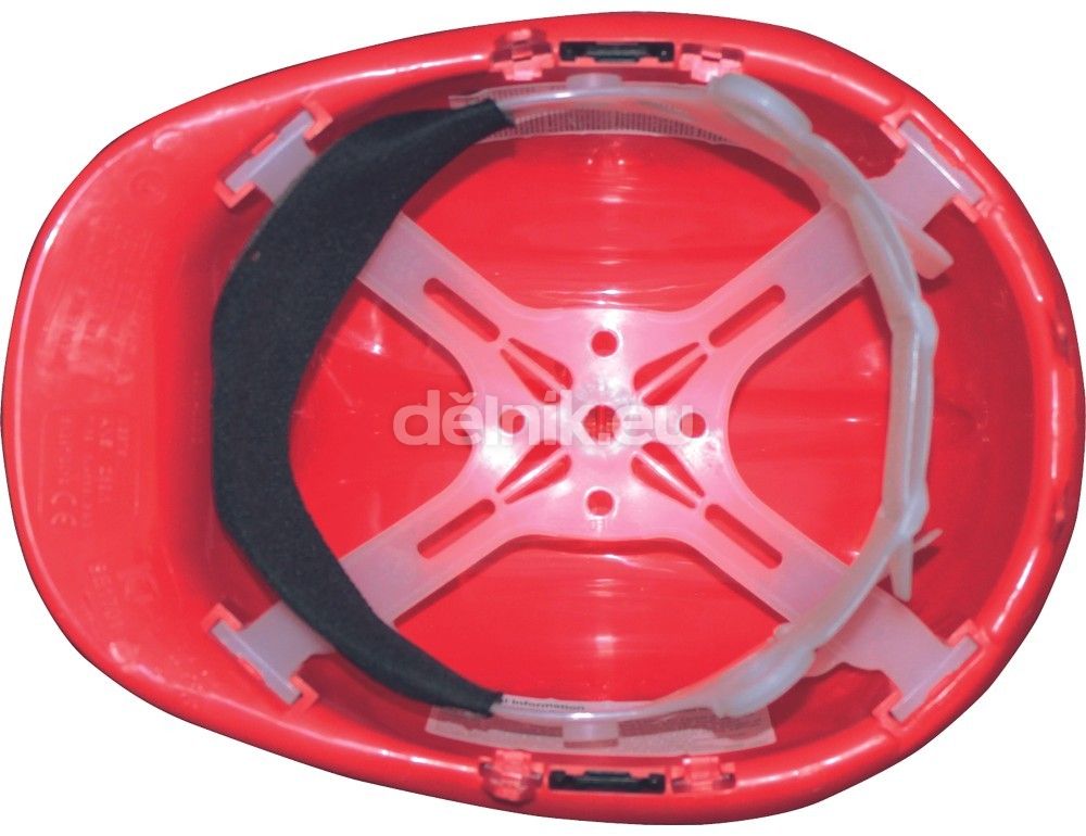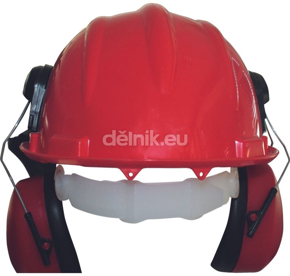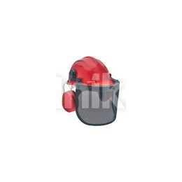 Lesnický komplet skládající se z: oranžové přilby z ABS s nastavitelnou velikostí posuvným páskem pro velikost 55–62 cm a 4 bodovým uchycením na PE náhlavním kříži, držákem štítu, drátěným štítem a červenými ochrannými sluchátky, 26 SNR, EN 352-3: 2002. Přilba – EN 397: 2012+A1: 2012, ANSI Z89.1