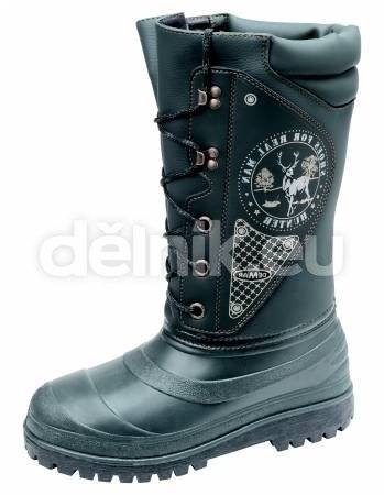 Myslivecká zimní obuv zelené barvy. Nepromokavá spodní část termokaučuk, vrchní díl syntetický mrazuvzdorný. Vyjímatelná vložka - beránek.