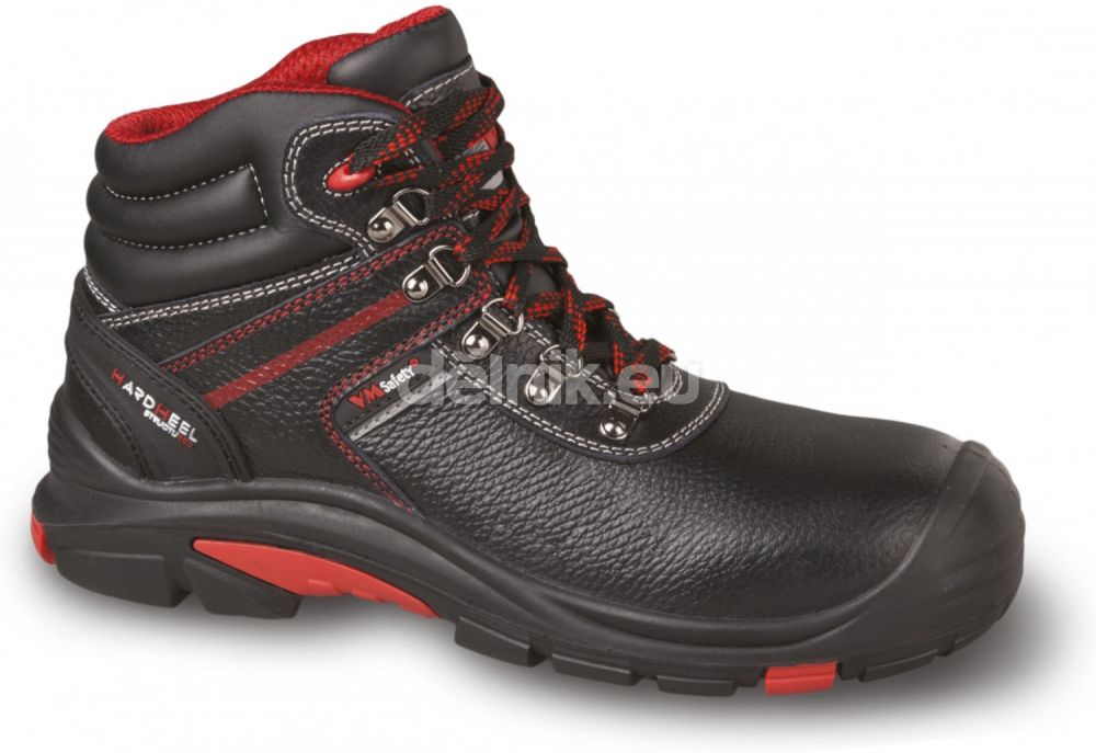 svršek: lícová hovězinová useň s dezénem v tloušťce 1,8 - 2,0 mm; podšívka: laminovaná prodyšná textile MESH; vkládací stélka: anatomicky tvarovaná z materiálu EVA s vysokou absorpční schopností, antistatická; podešev: PU/RUBBER - do 300°C, olejivzdorná, antistatická, protiskluzová, dvousložkový nástřik; velikost: 36 - 48; norma: ČSN EN ISO 20345:2012 (EN ISO 20345:2011); provedení: S3 HRO SRC - s kompozitní tužinkou a kevlarovou planžetou, hydrofobní