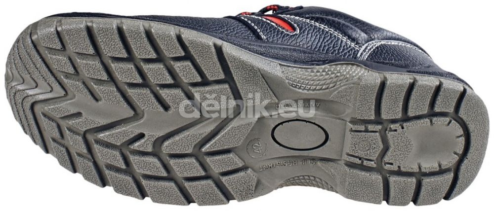 Bezpečnostní polobotka s ocelovou tužinkou, stélkou proti propíchnutí, PU/PU podrážkou rezistentní olejům. Svršek – reliéfní štípaná kůže. Stříbrné reflexní doplňky.