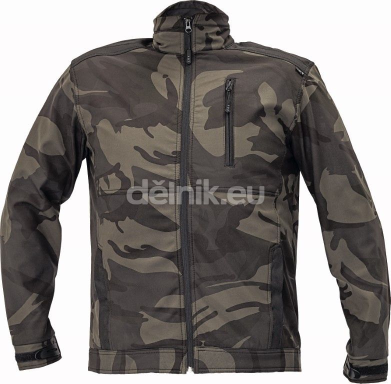 pánská softshellová bunda se stojáčkem; zesílená ramena Oxford 600 D; 2 boční kapsy na zip; 1 náprsní kapsa; nastavitelná šířka manžety rukávů díky suchému zipu; oblíbený a praktický maskáčový vzor; svrchní materiál: 100 % polyester, 300 g/m²; povrstvení: TPU