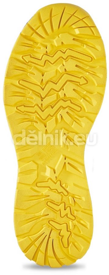 Pracovní sandál. Podešev -Phylon/Guma. Svršek je vyroben v kombinaci kůže a prodyšné síťoviny. Žluté doplňky zvyšují viditelnost uživatele.