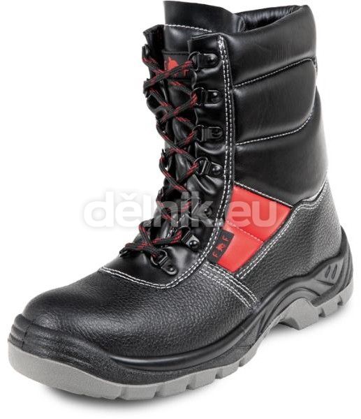 Bezpečnostní vysoká obuv s kovovou tužinkou a stélkou proti propichu. PU/PU antistatická podrážka rezistentní olejům, absorpcí energie v patě. Voděodolný svršek z embosované štípané kůže.
