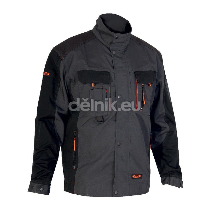 Pánská, rukávy do nastavitelné manžety, kryté zapínání na zip a na druky, multifunkční náprsní kapsy, boční kapsy na zip, materiál : canvas 65% polyester 35% bavlna 270g/m2, ramena vyztužena materiálem 600D polyester. Velikost: 46 - 64. Normy: EN340. Barva: šedo-černá, zelené doplňky.