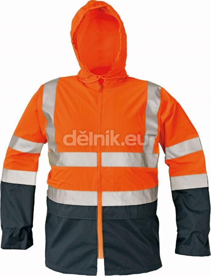 pánská HI-VIS bunda bez podšívky s kapucí skrytou v límci, podlepené švy; vysoká voděodolnost, paropropustná; reflexní 3M pruhy přes ramena, po obvodu boků a rukávů; 2 velké přední kapsy kryté klopou; spodní lem bundy a kapuce stažitelná na tkaničku; svrchní materiál: 100 % polyester, povrstvení: polyuretan