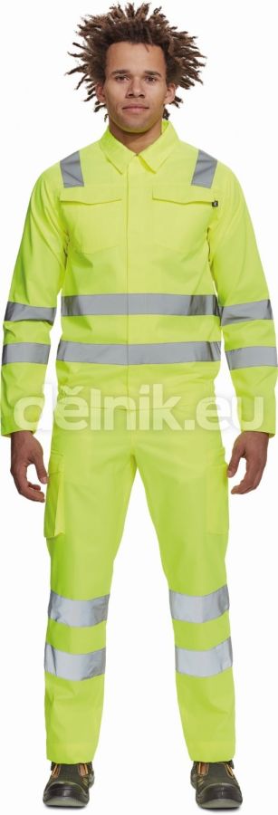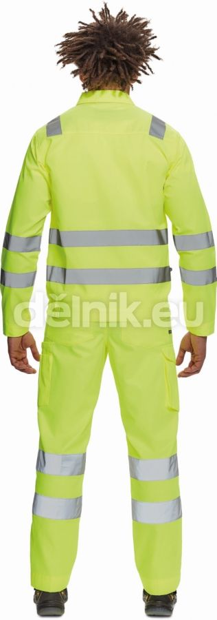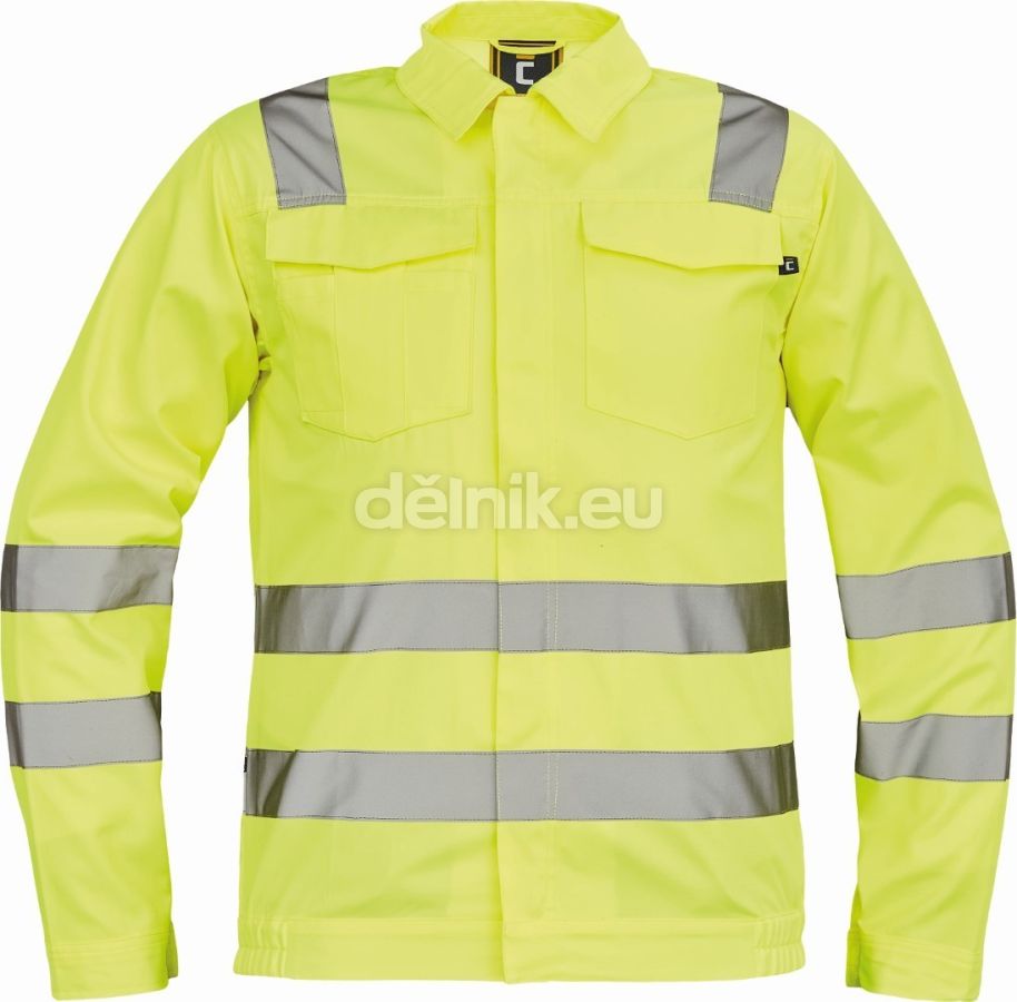 pánská lehká full HI-VIS pracovní bunda s reflexními pruhy přes ramena, v bocích a na rukávech; zapínání na zip kryté légou na suchý zip; 2 náprsní kapsy s klopou; nastavitelná šířka rukávů pomocí suchého zipu; elastický lem boků; svrchní materiál: 50 % bavlna, 50 % polyester, 200 g/m²