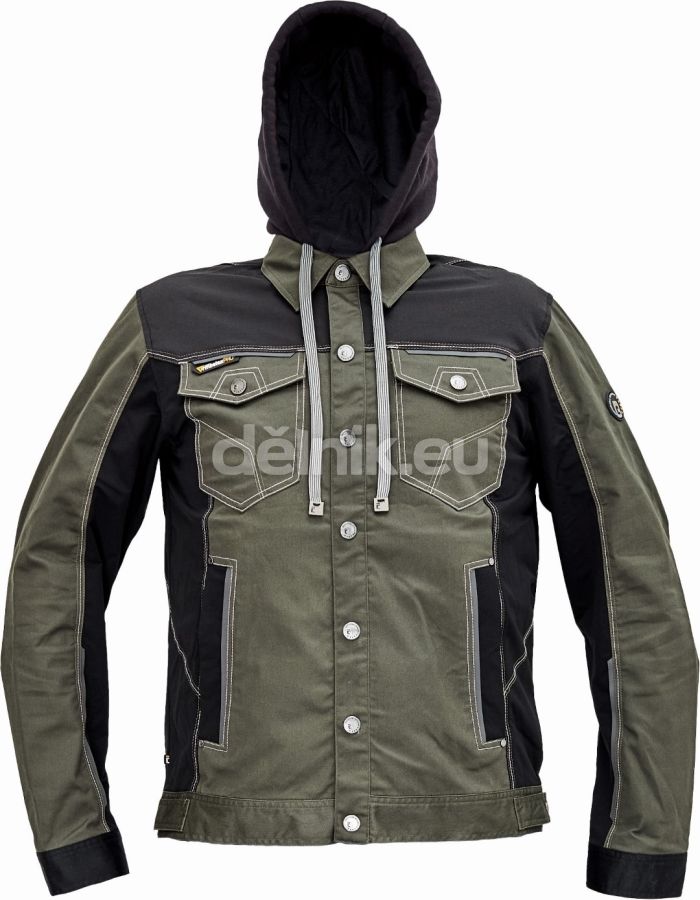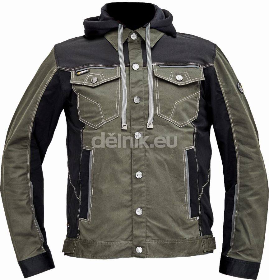 pánská pracovní bunda se stojacím límcem, zapínáním na druky a odepínací kapucí, elastický inovativní materiál TRIFIBETEX®, ergonomický střih, zesílená oblast ramen z materiálu CORDURA, 2 boční kapsy, 2 náprsní kapsy na druky, reflektivní prvky v barevném odstínu; svrchní materiál: 62 % bavlna, 35 % polyester, 3 % elastan, 260 g/m², TRIFIBETEX; svrchní zesílená vrstva: polyamid (nylon)