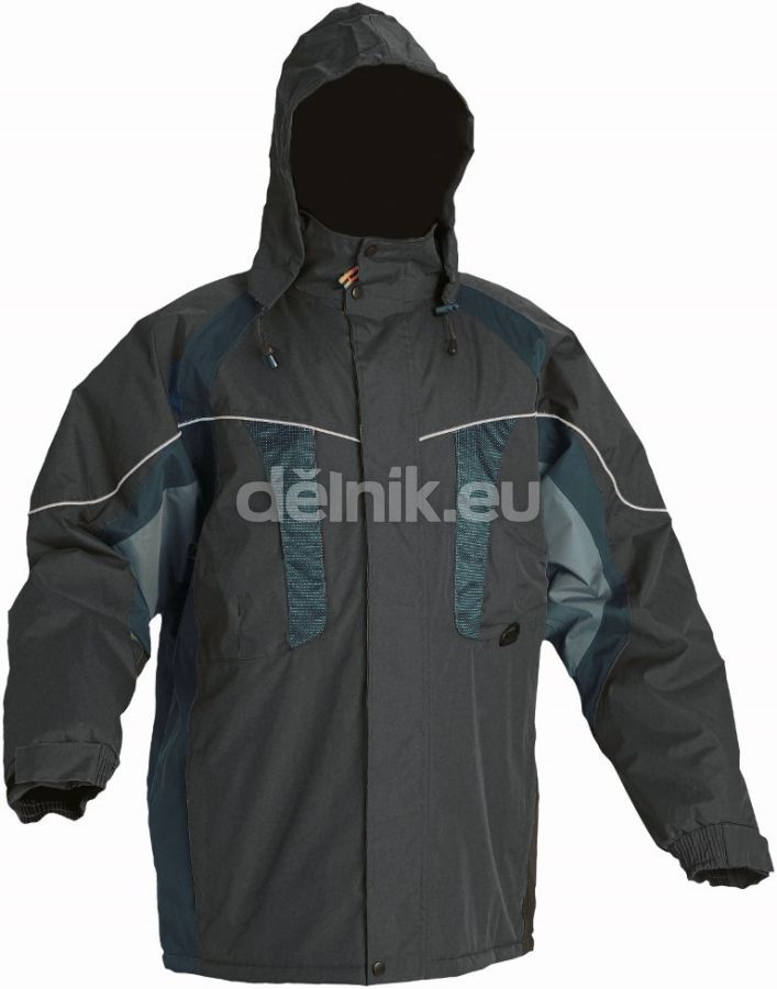 pánská nepromokavá zateplená zimní bunda s kapucí v límci, voděodolná; 2 boční kapsy, 2 náprsní kapsy na zip; nastavitelná šířka manžet rukávů pomocí suchého zipu; spodní lem ke stažení na šňůrku; reflexní doplňky; svrchní materiál: 100 % polyester, 230 g/m²; povrstvení: PVC