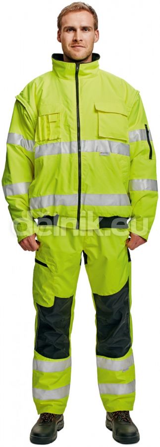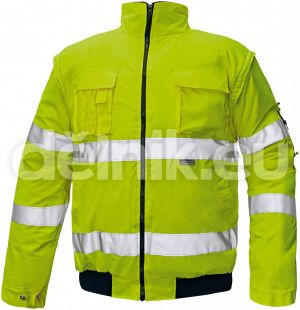 Hi-Vis bunda 2 v 1 s reflexními pruhy • odepínatelné rukávy a samostatně nositelná vesta • kapuce integrovaná v límci • podlepené švy • reflexní pásky 3M • voděodolnost tř. 3 dle normy EN 343 a paropropustnost tř. 1 dle normy