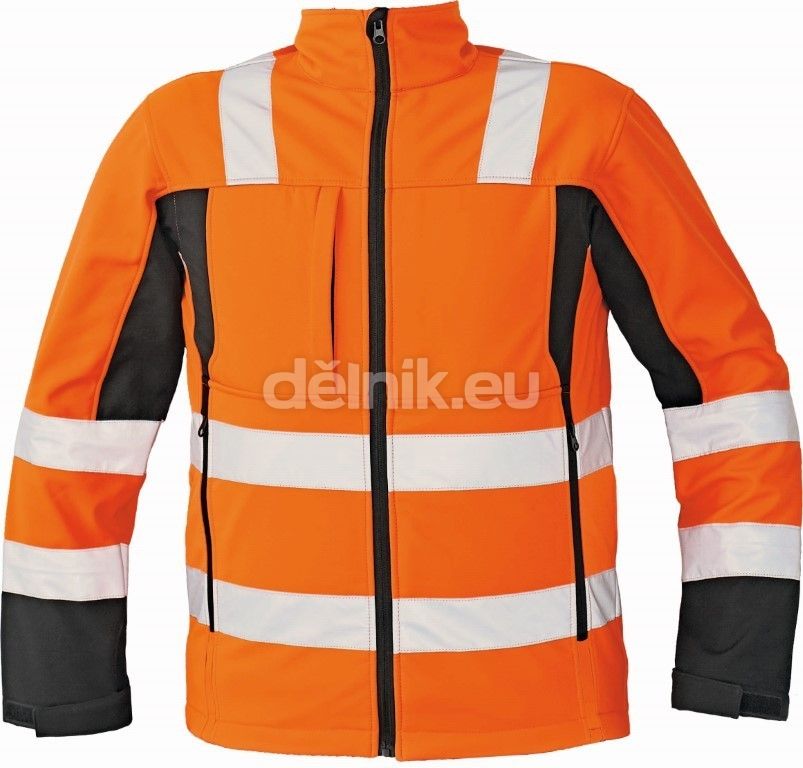 pánská HI-VIS softshellová voděodolná bunda; reflexní pruhy přes ramena, okolo boků a rukávů; 2 postranní kapsy na zip, 1 náprsní kapsa na zip; stahování ve spodní části; velcro nastavení šíře rukávů; vnitřní vrstva: 100 % polyester, 290 g/m²; svrchní materiál: 100 % polyester