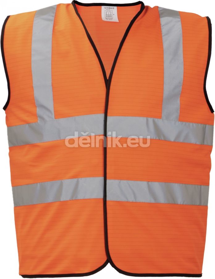 vesta s vysokou viditelností; reflektivní pruhy; zapínání na suchý zip; vhodné pro použítí v ESD chráněném prostoru; materiál: 98 % polyester, 2 % antistatické vlákno, 120 g/m²