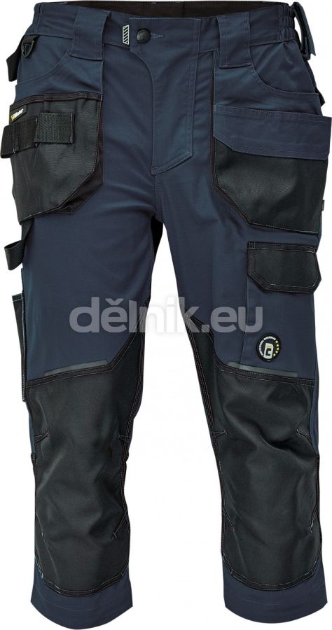 pánské pracovní 3/4 kalhoty; elastický inovativní materiál TRIFIBETEX; ergonomický střih; snížený pružný pas; odolné trojité prošití nohavic a sedu; zesílená oblast kolen s možností vkládání kolenních výztuh; prostorné multifunkční přední kapsy s poutky na nářadí; 2 zadní kapsy s klopou zesílené Oxfordem; stehenní kapsa na telefon s klopou a zapínáním na suchý zip; kapsa na metr a nůž; poutko na kladivo; "D" kroužek; poutko na nářadí v pase; originální zpracování zapínání kalhot; reflektivní prvky v barevném odstínu; svrchní materiál: 62 % bavlna, 35 % polyester, 3 % elastan, 260 g/m², TRIFIBETEX; svrchní zesílená vrstva: 100 % polyester