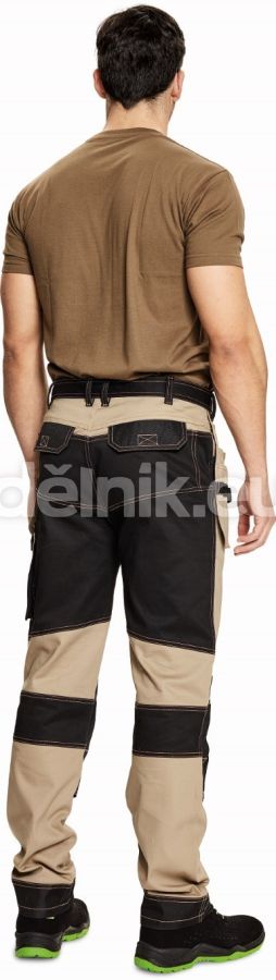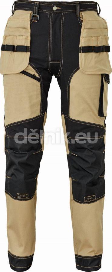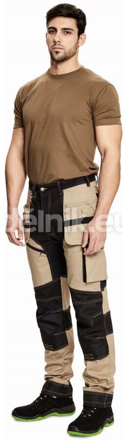 pánské pracovní kalhoty z elastického materiálu; 2 postranní kapsy a 2 vložitelné multifunkční kapsy na nářadí; "D" kroužek; 1 boční kapsa na nohavici s patkou; 1 kapsa na nohavici na zip; 2 nakládané zadní kapsy s patkou; zesílená oblast kolen s možností vkládání kolenních výztuh; záložka na nohavici umožňující prodloužení délky až o 5 cm; zesílená zadní strana spodku nohavice; dekorativní prošití; svrchní materiál: 98 % bavlna, 265 g/m², 2 % elastan