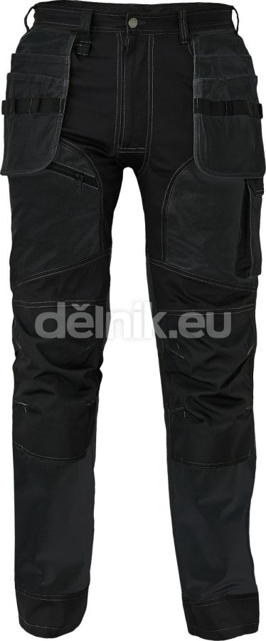 pánské pracovní kalhoty z elastického materiálu; 2 postranní kapsy a 2 vložitelné multifunkční kapsy na nářadí; "D" kroužek; 1 boční kapsa na nohavici s patkou; 1 kapsa na nohavici na zip; 2 nakládané zadní kapsy s patkou; zesílená oblast kolen s možností vkládání kolenních výztuh; záložka na nohavici umožňující prodloužení délky až o 5 cm; zesílená zadní strana spodku nohavice; dekorativní prošití; svrchní materiál: 98 % bavlna, 265 g/m², 2 % elastan