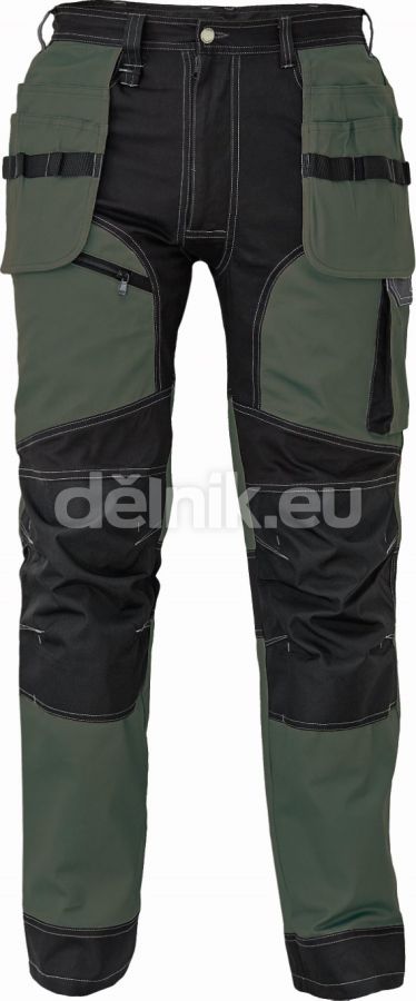 pánské pracovní kalhoty z elastického materiálu; 2 postranní kapsy a 2 vložitelné multifunkční kapsy na nářadí; "D" kroužek; 1 boční kapsa na nohavici s patkou; 1 kapsa na nohavici na zip; 2 nakládané zadní kapsy s patkou; zesílená oblast kolen s možností vkládání kolenních výztuh; záložka na nohavici umožňující prodloužení délky až o 5 cm; zesílená zadní strana spodku nohavice; dekorativní prošití; svrchní materiál: 98 % bavlna, 265 g/m², 2 % elastan