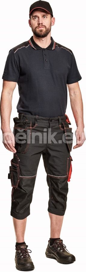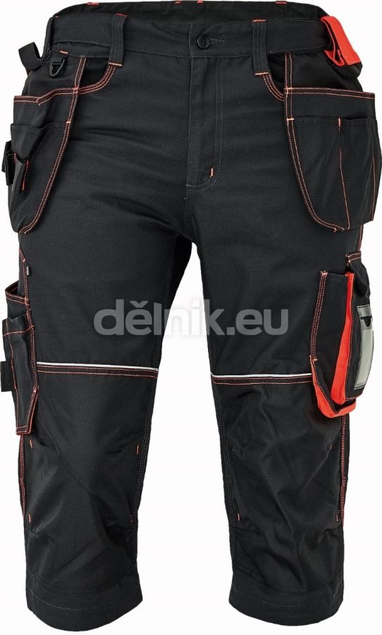 pánské pracovní 3/4 kalhoty s elastickým pasem; 2 postranní kapsy a 2 vložitelné multifunkční kapsy na nářadí; 2 boční kapsy na nohavicích + 1 transparentní pro ID kartu, D kroužek; 2 nakládané zadní kapsy s patkou; poutko na nářadí v kontrastní barvě; 2 postranní poutka na nářadí; zesílená oblast kolen s možností vkládání kolenních výztuh; dekorativní prošití a kontrastní prvky v hi-vis barvě; svrchní materiál: 65 % polyester, 35 % bavlna, 320 g/m²; svrchní zesílená vrstva: polyester