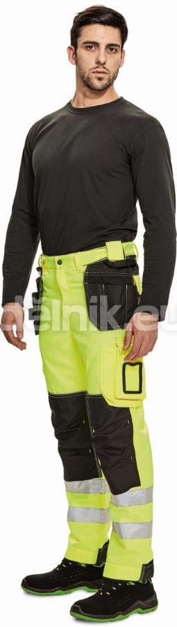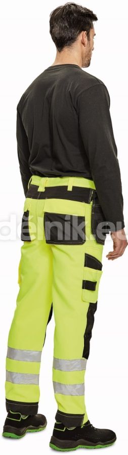 pánské pracovní kalhoty v hi-vis provedení s elastickým pasem; 2 postranní kapsy a 2 vložitelné multifunkční kapsy na nářadí; 2 boční kapsy na nohavicích + 1 transparentní pro ID kartu, D kroužek; 2 nakládané zadní kapsy s patkou; poutko na nářadí v kontrastní barvě; 2 postranní poutka na nářadí; zesílená oblast kolen s možností vkládání kolenních výztuh; záložka na nohavici umožňující prodloužení délky až o 5 cm; zesílená zadní strana spodku nohavice; dekorativní prošití; svrchní materiál: 80 % polyester, 20 % bavlna, 310 g/m²; svrchní zesílená vrstva: 100 % polyester
