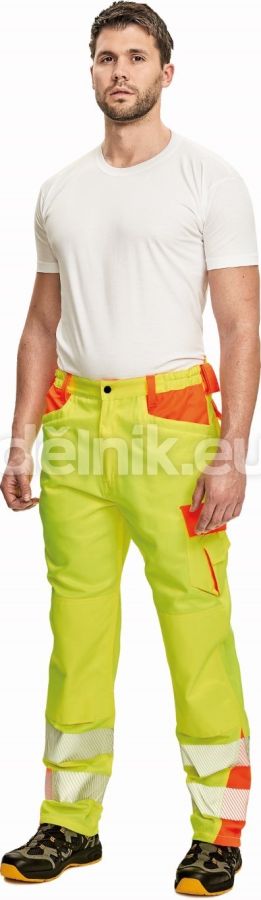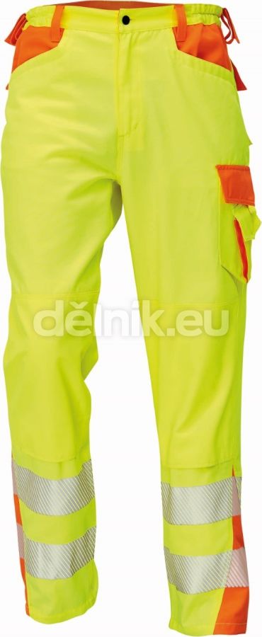 » pánské kalhoty v atraktivním provedení kombinace 2 hi-vis barev s reflexními natištěnými pruhy » 2 hluboké přední kaspy » 2 multifukční kapsy po stranách nohavice » 2 zadní kapsy s patkou » elastický pas a poutko na nářadí