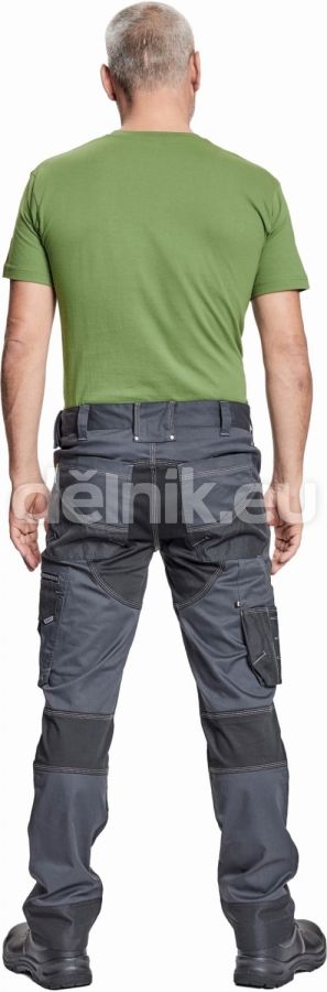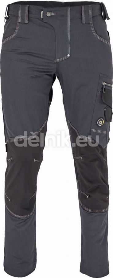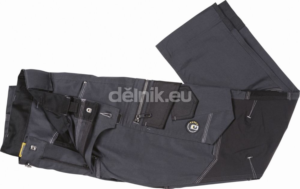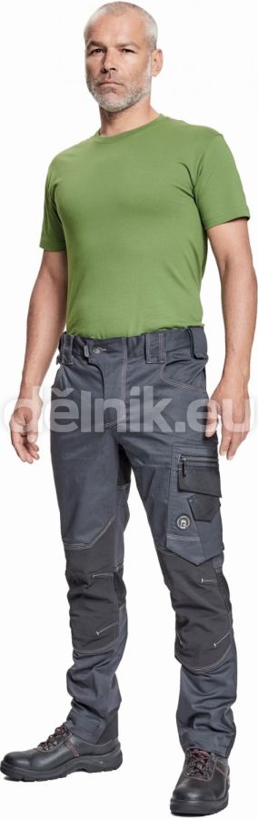 pánské pracovní kalhoty, elastický inovativní materiál TRIFIBETEX®, slim střih, snížený pružný pas, odolné trojité prošití nohavic a sedu, CORDURA zesílená oblast kolen, prostorné multifunkční přední kapsy s poutky na nářadí, 2 zadní kapsy, stehenní kapsa na telefon s klopou a zapínáním na suchý zip, kapsa na metr a nůž, poutko na kladivo, "D" kroužek, poutko na nářadí v pase, originální zpracování zapínání kalhot, reflektivní prvky v barevném odstínu, nastavitelná délka nohavic; svrchní materiál: 62 % bavlna, 35 % polyester, 3 % elastan, 260 g/m², TRIFIBETEX; svrchní zesílená vrstva: polyamid (nylon)