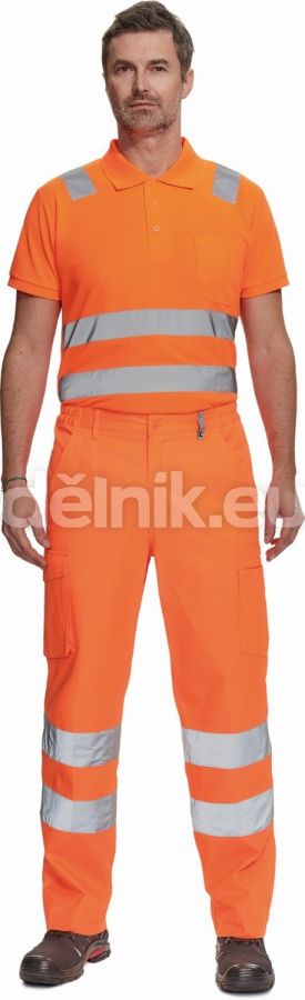 pánské lehké full HI-VIS pracovní kalhoty a reflexními pruhy na nohavicích, elastický pas; 2 boční kapsy, 1 kapsička na mince; 2 mul tifunkční stehenní kapsy; 2 zadní kapsy; nastavitelná délka nohavic; svrchní materiál: 50 % bavlna, 50 % polyester, 200 g/m²