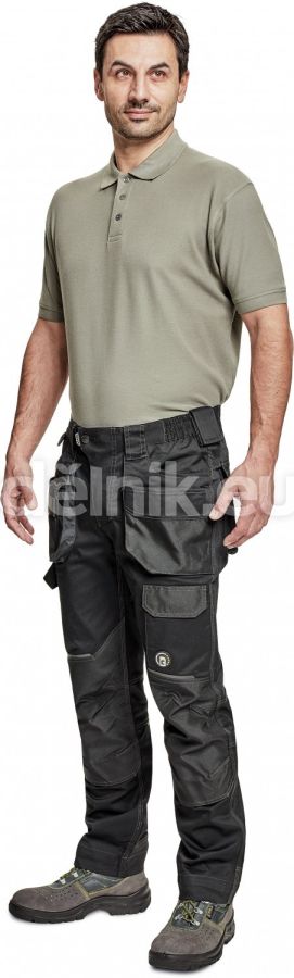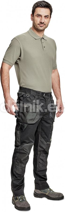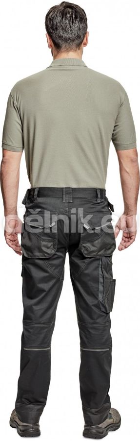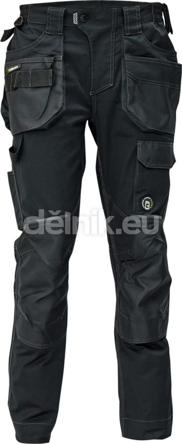 pánské pracovní kalhoty; elastický inovativní materiál TRIFIBETEX; ergonomický střih; snížený pružný pas; odolné trojité prošití nohavic a sedu; zesílená oblast kolen s možností vkládání kolenních výztuh; prostorné multifunkční přední kapsy s poutky na nářadí; 2 zadní kapsy s klopou zesílené Oxfordem; stehenní kapsa na telefon s klopou a zapínáním na suchý zip; kapsa na metr a nůž; poutko na kladivo; "D" kroužek; poutko na nářadí v pase; originální zpracování zapínání kalhot; reflektivní prvky v barevném odstínu; nastavitelná délka nohavic; svrchní materiál: 62 % bavlna, 35 % polyester, 3 % elastan, 260 g/m², TRIFIBETEX; svrchní zesílená vrstva: 100 % polyester