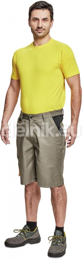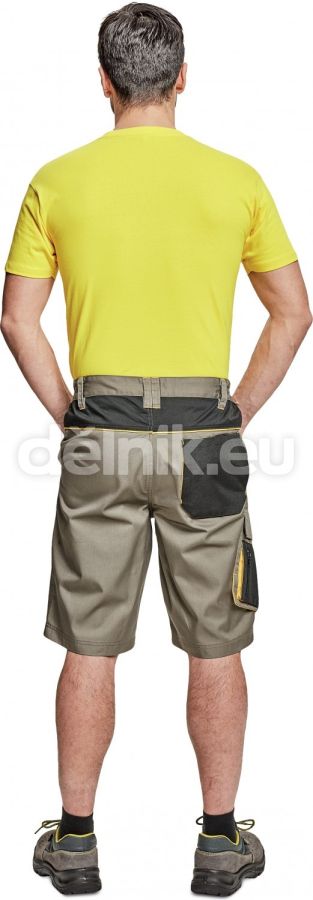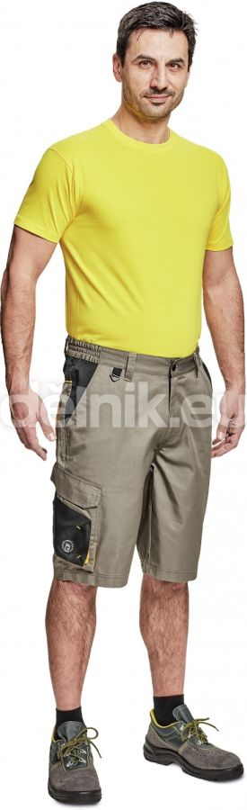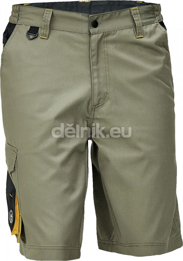 pánské pracovní šortky; materiál s vysokým procentem bavlněného podílu; moderní střih; 2 boční kapsy; 1 multifunkční kapsa na nohavici; 1 zadní kapsa se zapínáním na suchý zip; elastický pas; "D" kroužek; kontrastní paspulky; svrchní materiál: 60 % bavlna, 40 % polyester, 230 g/m²; svrchní zesílená vrstva: 100 % polyester