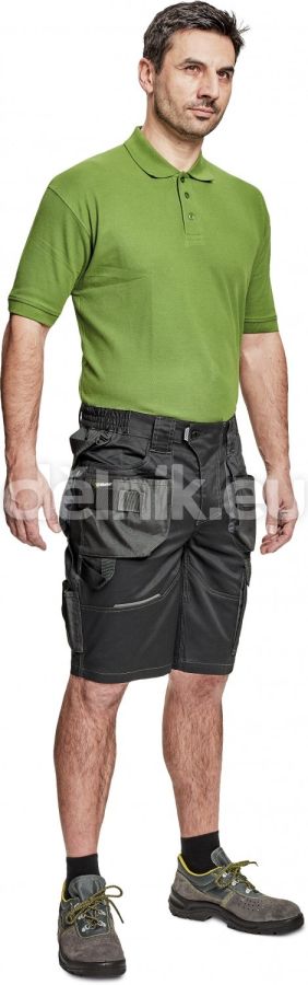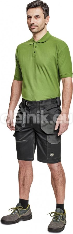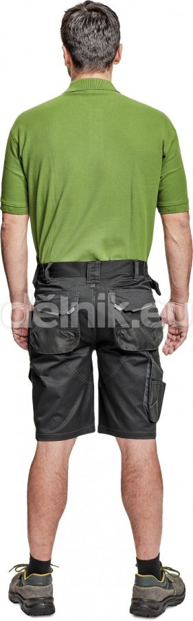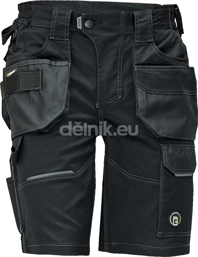 pánské pracovní šortky; elastický inovativní materiál TRIFIBETEX; ergonomický střih; snížený pružný pas; odolné trojité prošití nohavic a sedu; prostorné multifunkční přední kapsy s poutky na nářadí; 2 zadní kapsy s klopou zesílené Oxfordem; stehenní kapsa na telefon s klopou a zapínáním na suchý zip; kapsa na metr a nůž; poutko na kladivo; "D" kroužek; poutko na nářadí v pase; originální zpracování zapínání kalhot; reflektivní prvky v barevném odstínu; svrchní materiál: 62 % bavlna, 35 % polyester, 3 % elastan, 260 g/m², TRIFIBETEX; svrchní zesílená vrstva: 100 % polyester