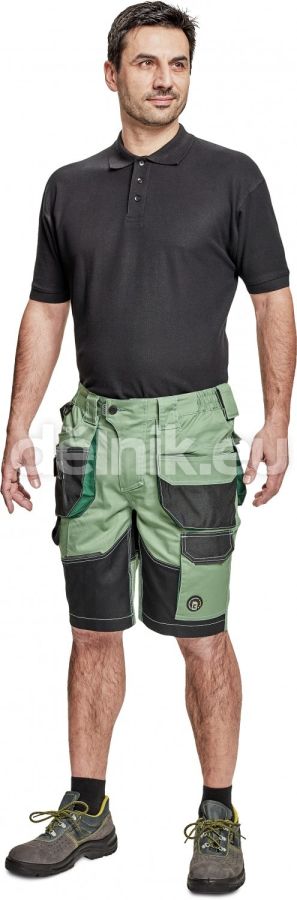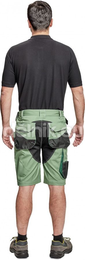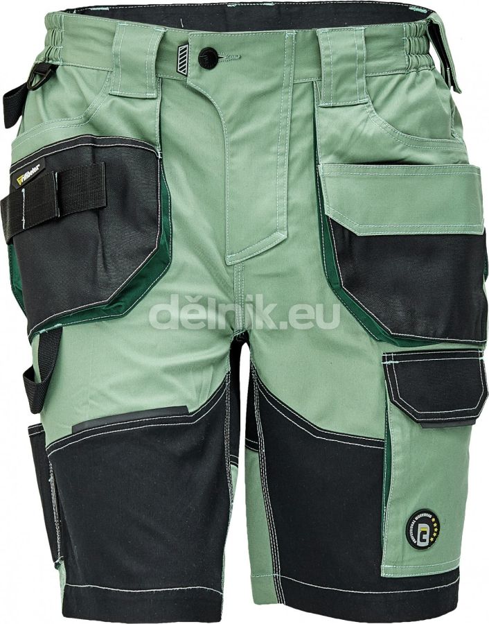 pánské pracovní šortky; elastický inovativní materiál TRIFIBETEX; ergonomický střih; snížený pružný pas; odolné trojité prošití nohavic a sedu; prostorné multifunkční přední kapsy s poutky na nářadí; 2 zadní kapsy s klopou zesílené Oxfordem; stehenní kapsa na telefon s klopou a zapínáním na suchý zip; kapsa na metr a nůž; poutko na kladivo; "D" kroužek; poutko na nářadí v pase; originální zpracování zapínání kalhot; reflektivní prvky v barevném odstínu; svrchní materiál: 62 % bavlna, 35 % polyester, 3 % elastan, 260 g/m², TRIFIBETEX; svrchní zesílená vrstva: 100 % polyester