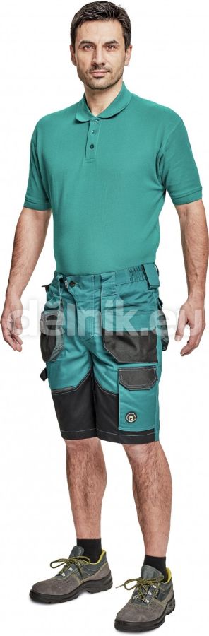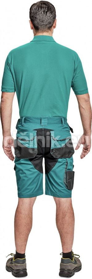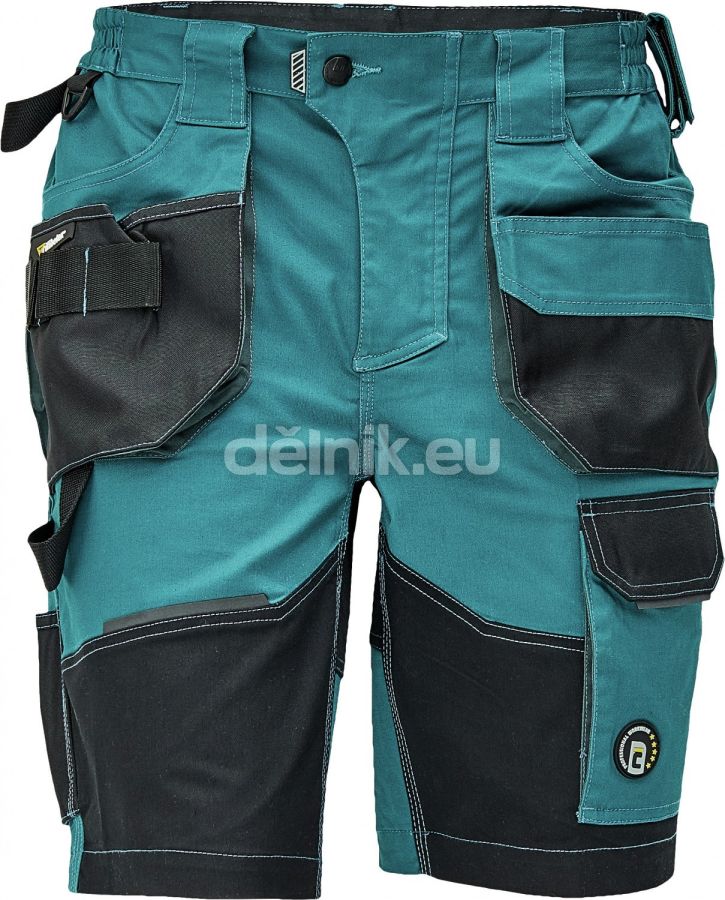 pánské pracovní šortky; elastický inovativní materiál TRIFIBETEX; ergonomický střih; snížený pružný pas; odolné trojité prošití nohavic a sedu; prostorné multifunkční přední kapsy s poutky na nářadí; 2 zadní kapsy s klopou zesílené Oxfordem; stehenní kapsa na telefon s klopou a zapínáním na suchý zip; kapsa na metr a nůž; poutko na kladivo; "D" kroužek; poutko na nářadí v pase; originální zpracování zapínání kalhot; reflektivní prvky v barevném odstínu; svrchní materiál: 62 % bavlna, 35 % polyester, 3 % elastan, 260 g/m², TRIFIBETEX; svrchní zesílená vrstva: 100 % polyester