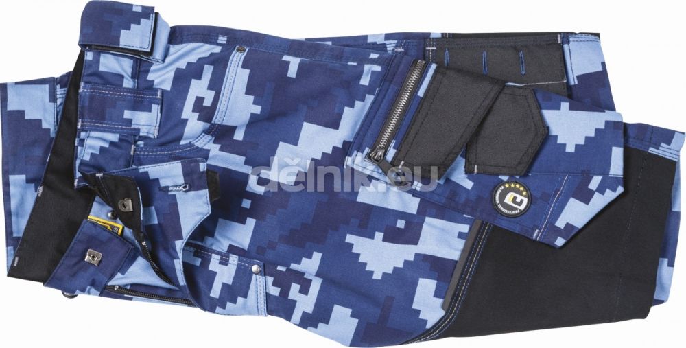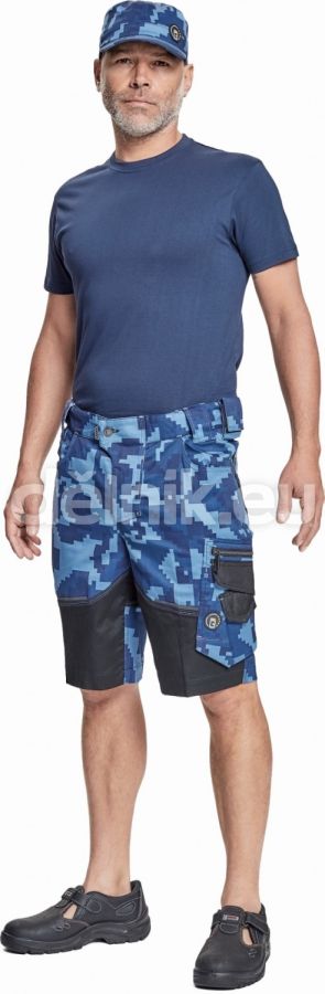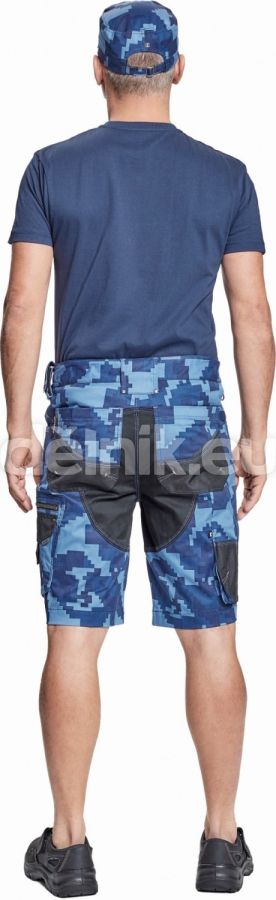pánské pracovní šortky, elastický inovativní materiál TRIFIBETEX® v přírodním maskování, ergonomický střih, snížený pružný pas, odolné trojité prošití nohavic a sedu, prostorné multifunkční přední kapsy s poutky na nářadí, 2 zadní kapsy na suchý zip, stehenní kapsa na telefon s klopou a zapínáním na suchý zip, kapsa na metr a nůž, poutko na kladivo, "D" kroužek, poutko na nářadí v pase, originální zpracování zapínání kalhot, reflektivní prvky v barevném odstínu; svrchní materiál: 62 % bavlna, 35 % polyester, 3 % elastan, 260 g/m², TRIFIBETEX; svrchní zesílená vrstva: polyamid (nylon)