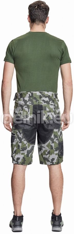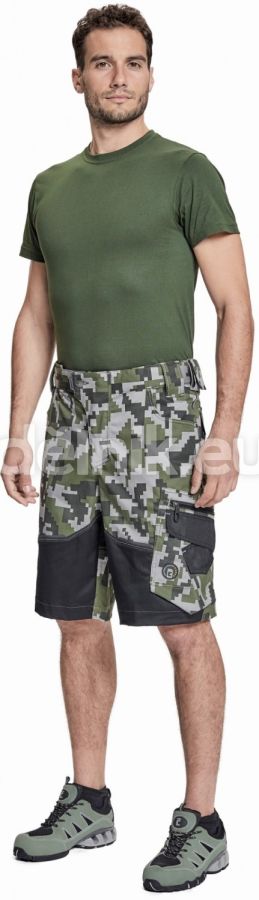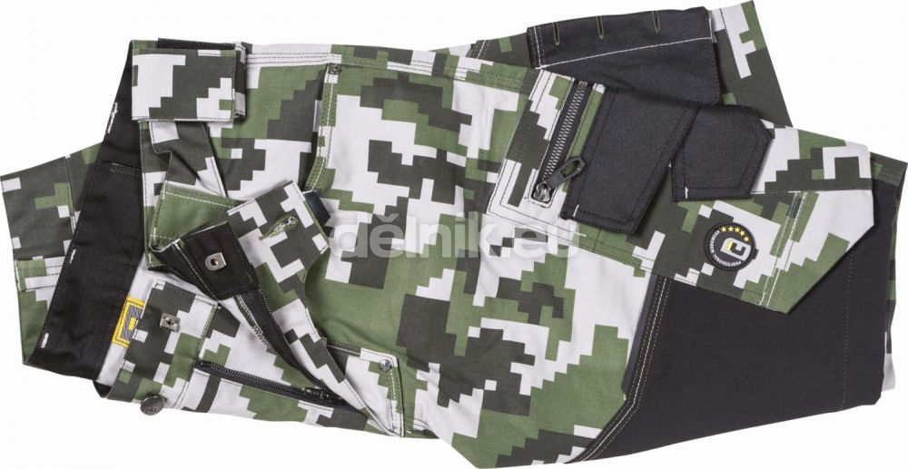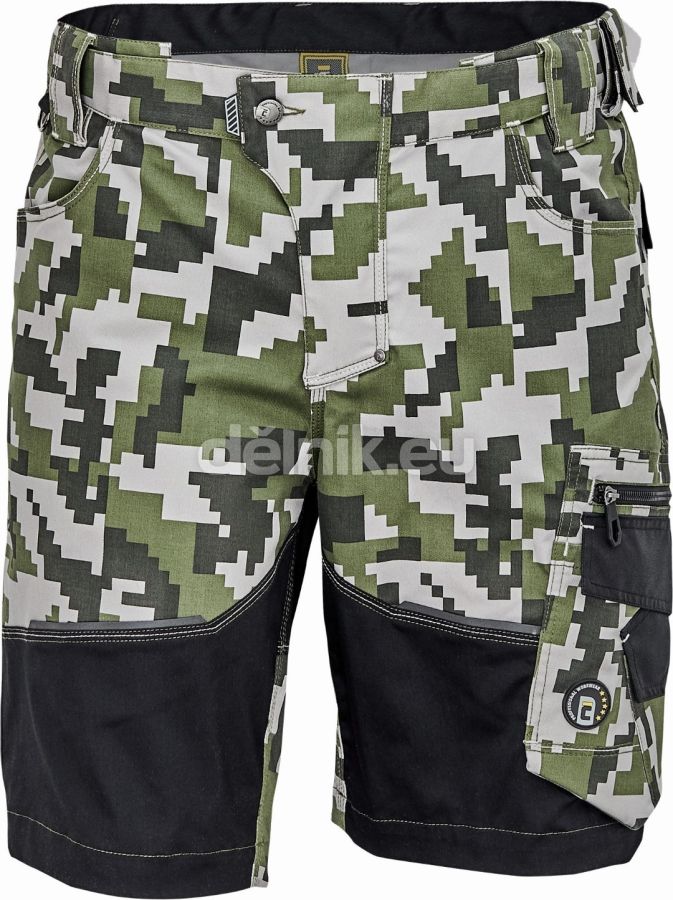 pánské pracovní šortky, elastický inovativní materiál TRIFIBETEX® v přírodním maskování, ergonomický střih, snížený pružný pas, odolné trojité prošití nohavic a sedu, prostorné multifunkční přední kapsy s poutky na nářadí, 2 zadní kapsy na suchý zip, stehenní kapsa na telefon s klopou a zapínáním na suchý zip, kapsa na metr a nůž, poutko na kladivo, "D" kroužek, poutko na nářadí v pase, originální zpracování zapínání kalhot, reflektivní prvky v barevném odstínu; svrchní materiál: 62 % bavlna, 35 % polyester, 3 % elastan, 260 g/m², TRIFIBETEX; svrchní zesílená vrstva: polyamid (nylon)