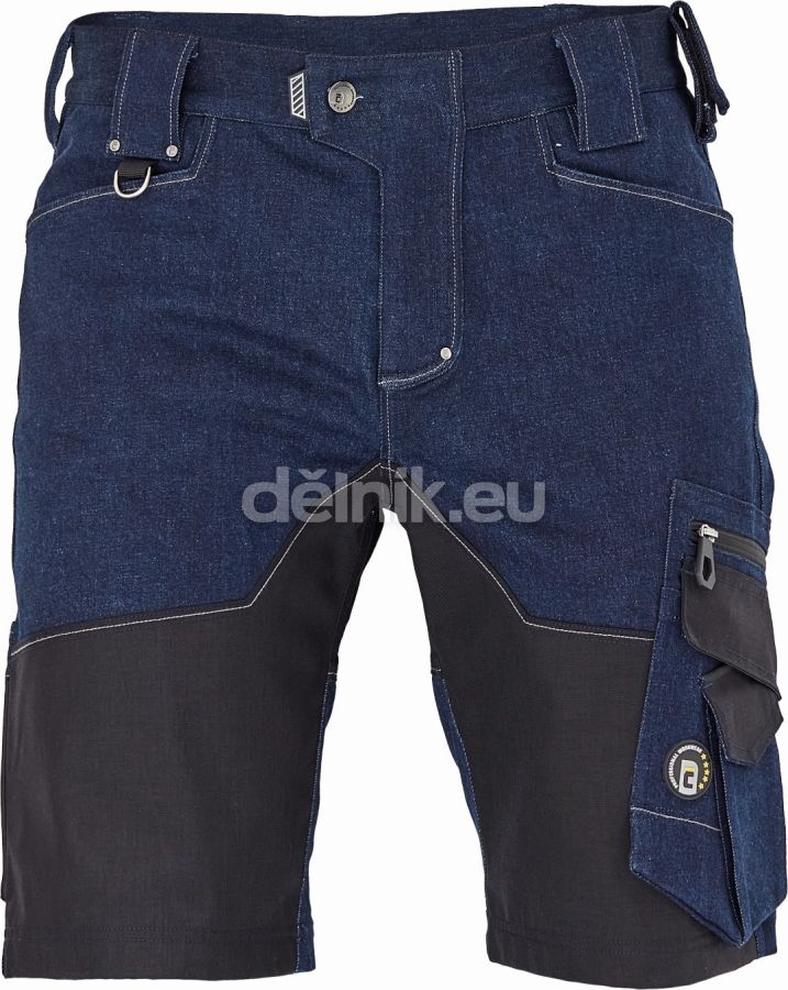 pánské pracovní šortky, elastická předepraná denim látka, slim střih, snížený pružný pas, odolné trojité prošití nohavic a sedu, CORDURA a TRIFIBETEX zesílená část stehen a sedu, prostorné multifunkční přední kapsy s poutky na nářadí, 2 zadní kapsy, stehenní kapsa na telefon s klopou a zapínáním na suchý zip, kapsa na metr a nůž, poutko na kladivo, "D" kroužek, poutko na nářadí v pase, originální zpracování zapínání kalhot; svrchní materiál: 97 % bavlna, 3 % elastan, 370 g/m², TRIFIBETEX; svrchní zesílená vrstva: polyamid (nylon)