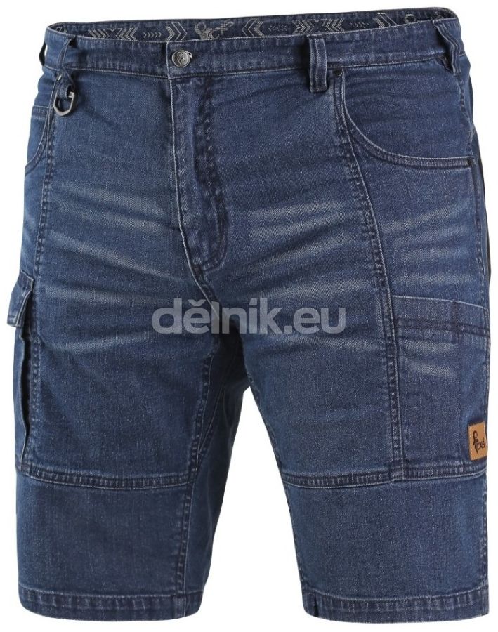 Pánské džínové kraťasy, pas s poutky na opasek a plastovým přívěskem, 2 přední kapsy, 2 zadní kapsy z materiálu CORDURA, boční multifunkční kapsy, na pravé kapse poutko pro kladivo. Základní materiál: 98 % denim bavlna 2 % elastan, 350 g/m2, Cordura: 100 % nylon, 255 g/m2.