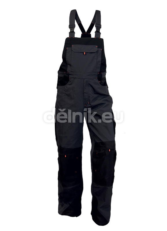 Pánské s náprsenkou, zesílená kolena s možností vložení kolenních výztuh, pevný pas s poutky na opasek, přední klínové kapsy, zadní kapsy s klopama, boční multifunkční kapsy, náprsenka s velkou kapsou a kapsičkami na tužky, vnitřní náprsenková kapsa na zip, materiál : canvas 65% polyester 35% bavlna 270g/m2, spodní část nohavic vyztužena materiálem 600D polyester. Velikost: 46 - 64. Normy: EN340. Barva: šedo-černá, zelené doplňky.
