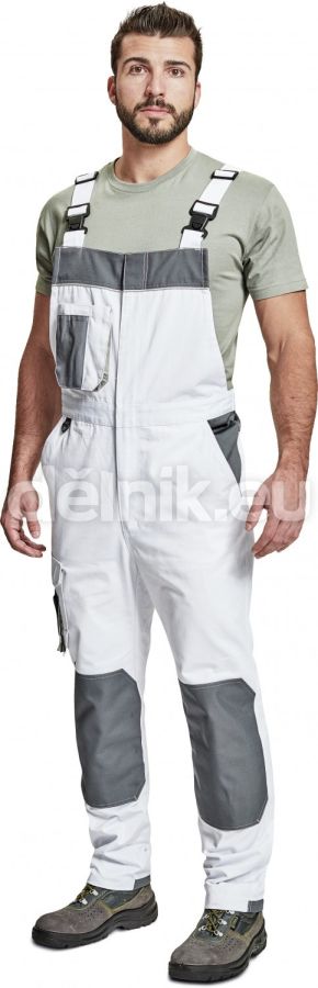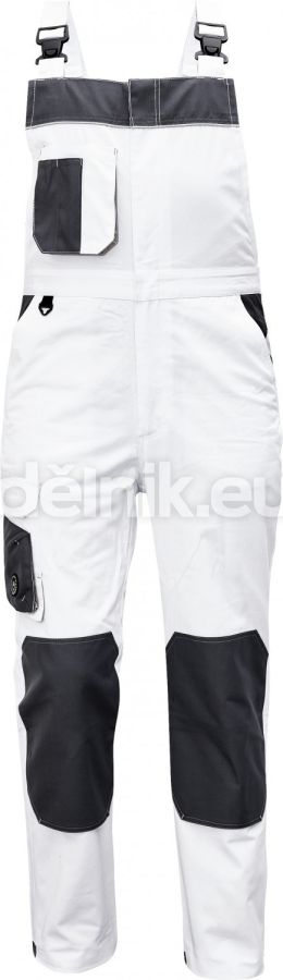 pánské pracovní kalhoty s laclem; materiál s vysokým procentem bavlněného podílu; moderní střih; zesílená oblast kolen materiálem Oxford s možností vkládání kolenních výztuh; 2 boční kapsy; 1 multifunkční kapsa na nohavici; 1 zadní kapsa se zapínáním na suchý zip; 1 náprsní multifunkční kapsa; elastický pas; "D" kroužek; dvoucestný zip; kontrastní paspulky; nastavitelná délka; svrchní materiál: 60 % bavlna, 40 % polyester, 230 g/m²; svrchní zesílená vrstva: 100 % polyester