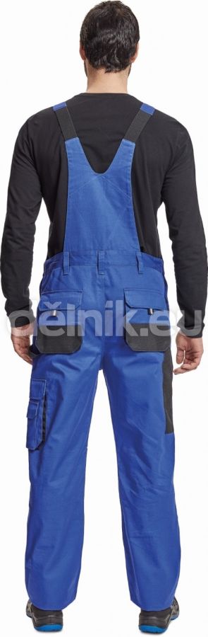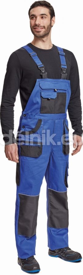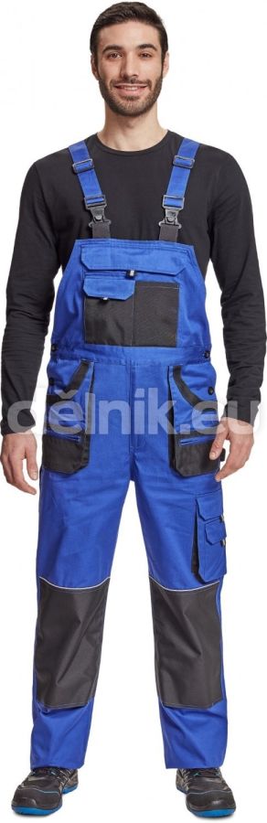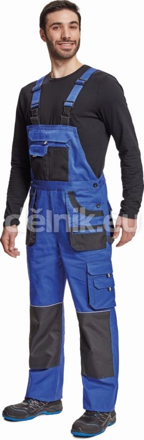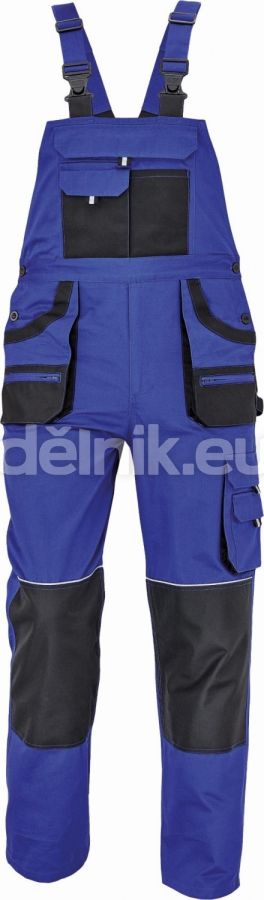 pánské bavlněné pracovní kalhoty s laclem; 7 funkčních kapes; oboustranné zapínání v pase na knoflíky; polyester Oxford zesílení v kolenních částech s možností vkládání ochranných nákoleníků; nastavitelná délka nohavic; svrchní materiál: 100 % bavlna, 235 g/m²; svrchní zesílená vrstva: 100 % polyester