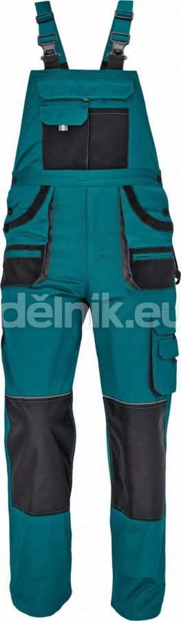 pánské bavlněné pracovní kalhoty s laclem; 7 funkčních kapes; oboustranné zapínání v pase na knoflíky; polyester Oxford zesílení v kolenních částech s možností vkládání ochranných nákoleníků; nastavitelná délka nohavic; svrchní materiál: 100 % bavlna, 235 g/m²; svrchní zesílená vrstva: 100 % polyester