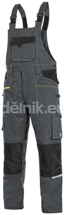 Pánské montérkové kalhoty s náprsenkou, strečová tkanina umožňující volný pohyb, náprsní kapsa s klopou, pas s poutky na opasek, přední kapsy s kapsou na zip, multifunkční kapsy na obou stranách, kolena zesílena 600D polyesterem s možností vložení kolenních výztuh, dvě zadní kapy - jedna s klopou, zadní spodní lem nohavice vyztužen 600D polyesterem, šle s gumou vzadu, reflexní doplňky. Doporučené použití: strojírenství, stavebnictví, lehký průmysl, automobilový průmysl, logistika, skladová manipulace, spedice, autoservisy, údržba, montáže, zemědělství, zahrada, hobby.