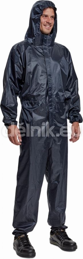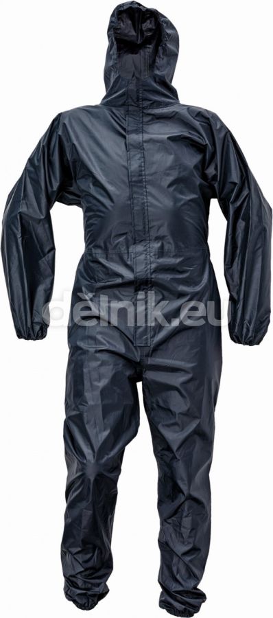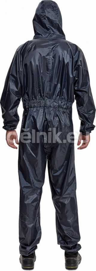 voděodolný overal s kapucí; přední zapínání na zip kryté klopou na suchý zip; přelepené švy; elastický pas, lemy rukávů, nohavic a kapuce na gumičku; svrchní materiál: 100 % polyester; povrstvení: PVC
