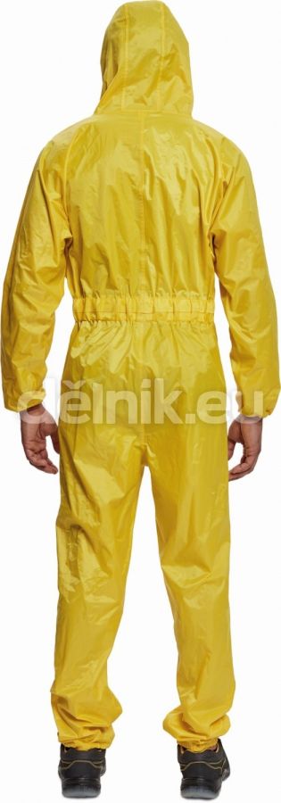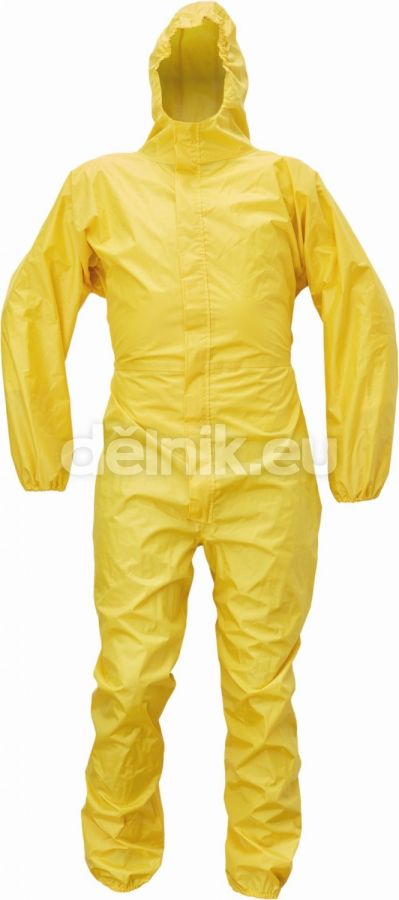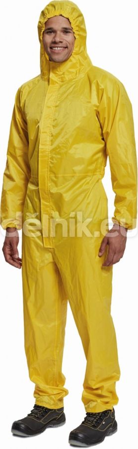 voděodolný overal s kapucí; přední zapínání na zip kryté klopou na suchý zip; přelepené švy; elastický pas, lemy rukávů, nohavic a kapuce na gumičku; svrchní materiál: 100 % polyester; povrstvení: PVC