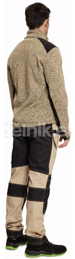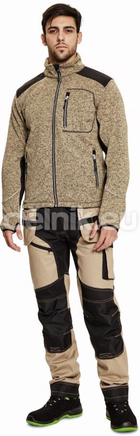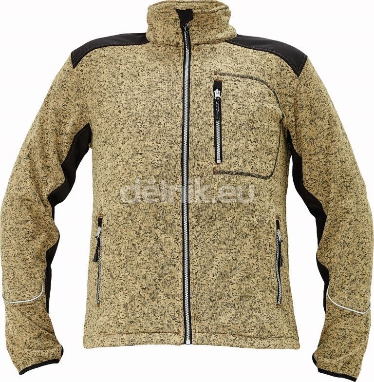 pánský svetr z melírovaného úpletu se zapínáním na zip; zesílená část v oblasti ramen a rukávů softshellovým materiálem; 2 přední kapsy na zip; 1 náprsní kapsa na zip; nastavitelná šíře spodního lemu; očko na palec na konci rukávu; svrchní materiál: 100 % polyester, 265 g/m²
