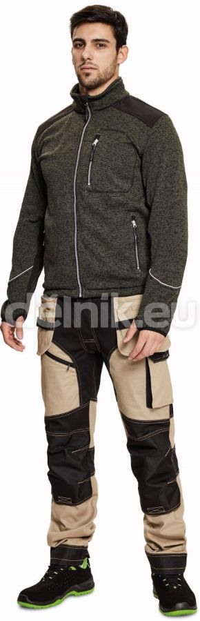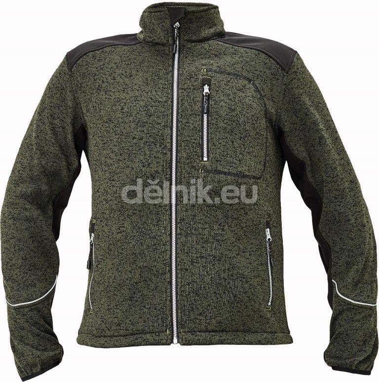 pánský svetr z melírovaného úpletu se zapínáním na zip; zesílená část v oblasti ramen a rukávů softshellovým materiálem; 2 přední kapsy na zip; 1 náprsní kapsa na zip; nastavitelná šíře spodního lemu; očko na palec na konci rukávu; svrchní materiál: 100 % polyester, 265 g/m²
