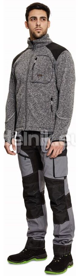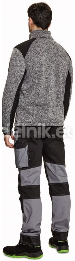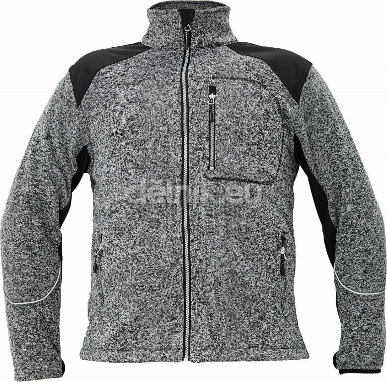 pánský svetr z melírovaného úpletu se zapínáním na zip; zesílená část v oblasti ramen a rukávů softshellovým materiálem; 2 přední kapsy na zip; 1 náprsní kapsa na zip; nastavitelná šíře spodního lemu; očko na palec na konci rukávu; svrchní materiál: 100 % polyester, 265 g/m²