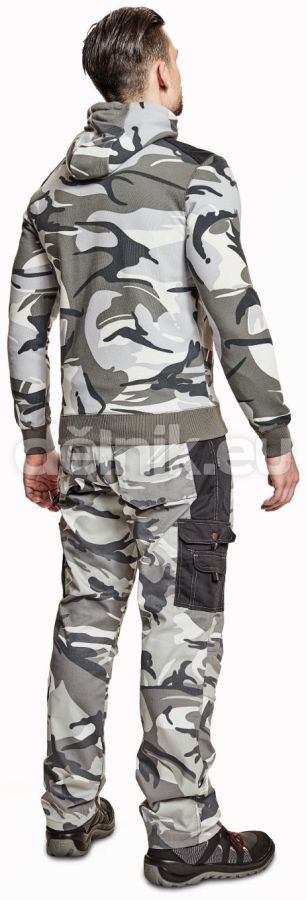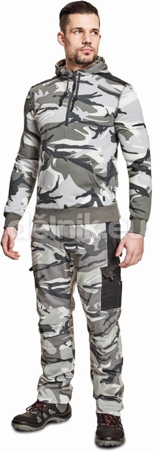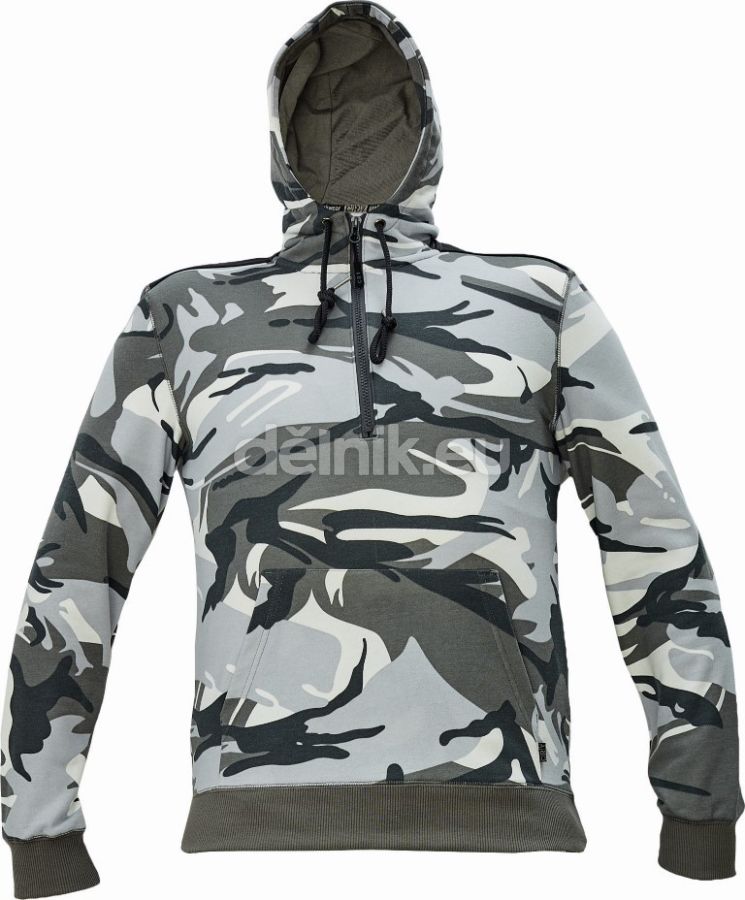 pánská polopropínací bunda s kapucí a klokaní kapsou; zesílené části v oblasti ramen; elastické náplety na rukávech a spodním obvodu; oblíbený a praktický maskáčový vzor; svrchní materiál: 65 % polyester, 35 % bavlna, 340 g/m²