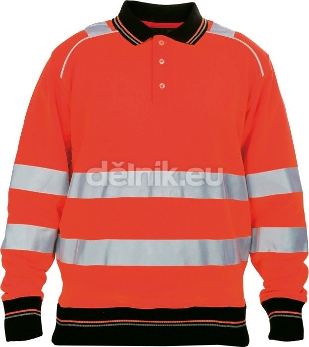 pánská HI-VIS mikina s límečkem z počesaného výplňku směsi polyesteru a bavlny; propínací léga na 3 knoflíky; kontrastní proužky v nápletech rukávů a spodním lemu; dvojice reflexních pruhů po obvodu pasu a rukávů a přes ramena; dekorativní prošití v HI-VIS barvě; svrchní materiál: 60 % polyester, 40 % bavlna, 300 g/m²