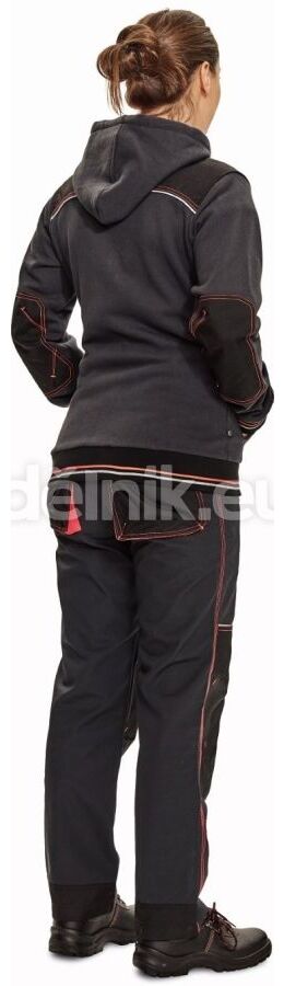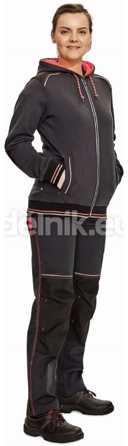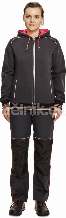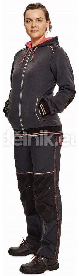 dámská celopropínací mikina s kapucí z počesaného směsového úpletu bavlny a polyesteru; zesílená oblast ramen a loktů; reflexní paspulka lemující sedlo a lištové kapsy; dvojitá kapuce s kontrastním hi-vis úpletem v barvě zipu a dekorativního prošití; pružné náplety na rukávech a spodním obvodu; svrchní materiál: 55 % bavlna, 45 % polyester, 300 g/m²