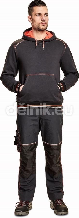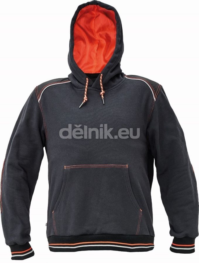 pánská mikina s kapucí a klokaní kapsou ze směsového počesaného úpletu bavlny a polyesteru; zesílená oblast ramen a loktů; reflexní paspulka lemující sedlo a loštové kapsy; dvojitá kapuce; dekorativní prošití; pružné náplety na rukávech a spodním obvodu; svrchní materiál: 55 % bavlna, 300 g/m², 45 % polyester